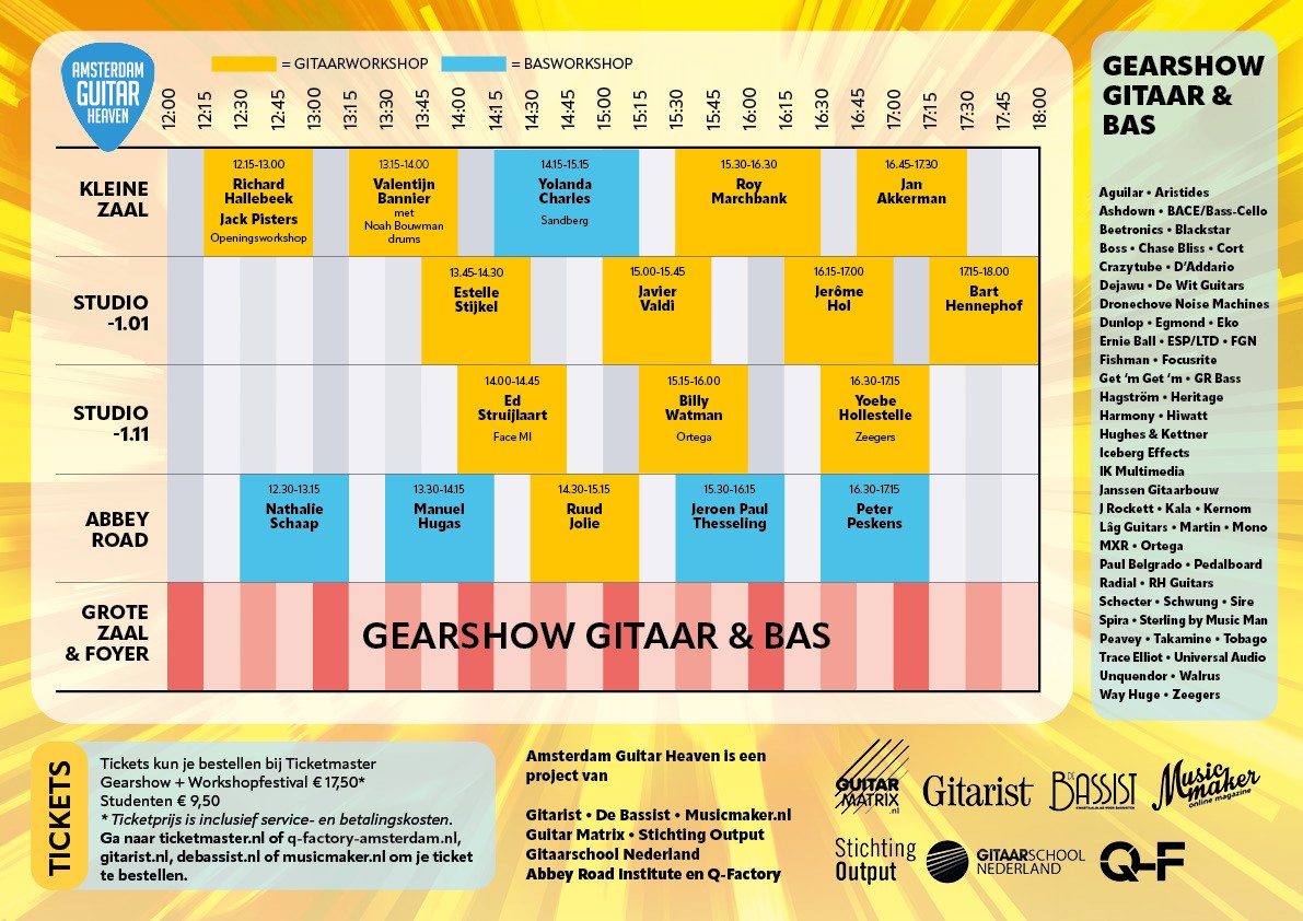 Voor een ticket van 17,50 euro kun je op Amsterdam Guitar Heaven de hele dag de Gearshow Gitaar & Bas bezoeken en ook nog alle workshops bijwonen! Amsterdam Guitar Heaven op zaterdag 22 november wordt weer een topevenement, dat we organiseren samen met onze collega’s van De Bassist en Musicmaker.nl, Jack Pisters’ Guitar Matrix, GitaarschoolNederland.nl en Q-Factory.