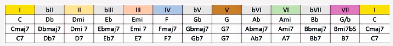 In deze les gaan we bluesy lijnen spelen die soms bewust buiten de akkoorden van de begeleiding stappen. In les 4 maakten we kennis met de vijf neventrappen in de vorm van maj7-akkoorden en in les 6 koppelden
