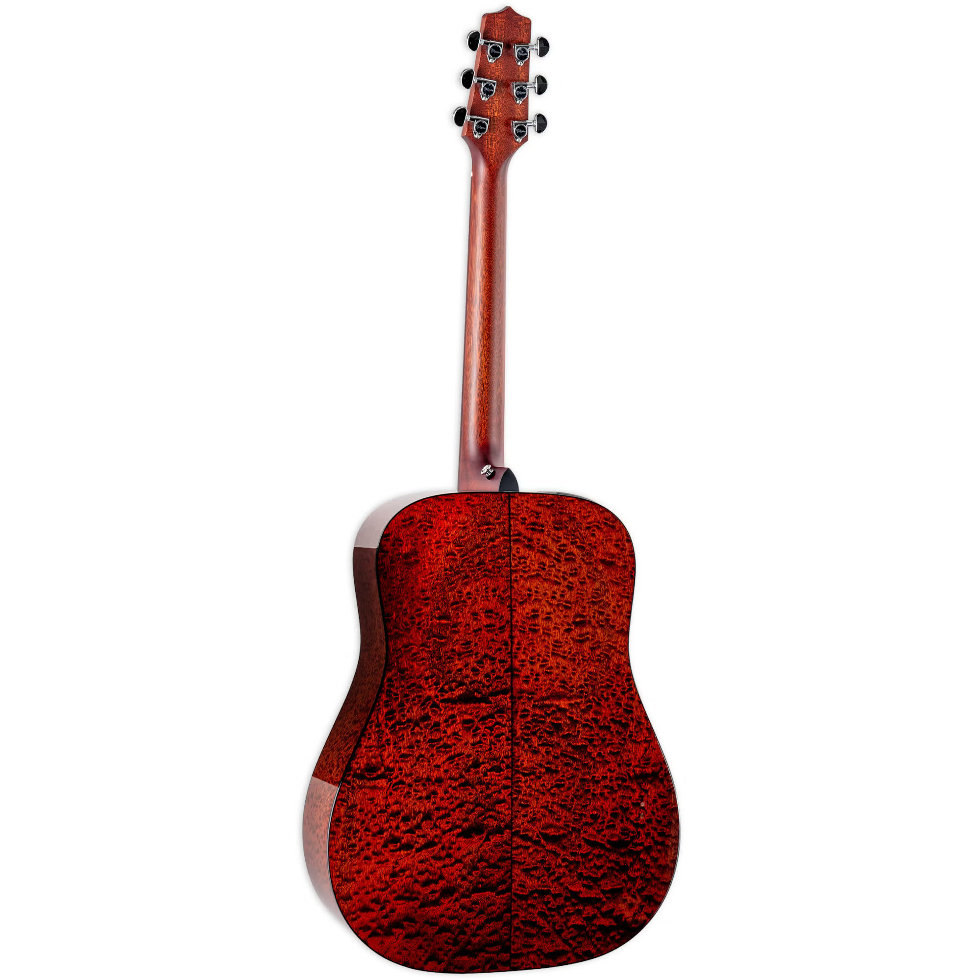Net als bij veel andere merken is het dreadnought-model een vaste waarde in de catalogus van Takamine. Dit specifieke model, dat gemaakt is in Japan en waarvan er wereldwijd slechts 300 exemplaren worden uitgebracht, heeft een zeldzame en prachtige achter- en zijkant van burled sapele. Sapele is een mahoniehoutsoort die een warme klank geeft en er - in dit geval - ook bijzonder mooi uitziet met de tekening van het hout.