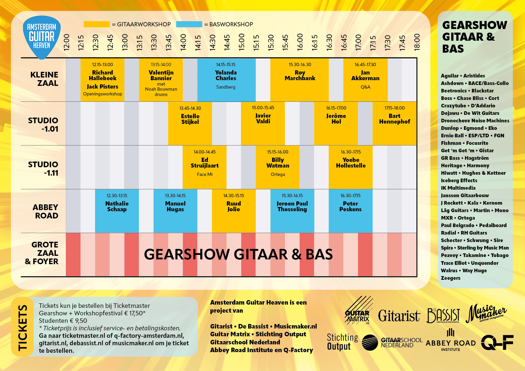 Voor een ticket van 17,50 euro kun je op Amsterdam Guitar Heaven de hele dag de Gearshow Gitaar & Bas bezoeken en ook nog alle workshops bijwonen! Amsterdam Guitar Heaven op zaterdag 22 november wordt weer een topevenement, dat we organiseren samen met onze collega’s van De Bassist en Musicmaker.nl, Jack Pisters’ Guitar Matrix, GitaarschoolNederland.nl en Q-Factory.