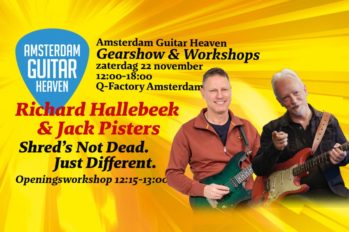 Tussen 12 en 6 kan je zo’n 20 workshops bijwonen. Thema van de workshops is dit jaar ‘Shred’s Not Dead. Just Different’, ofwel: virtuositeit in dienst van de muziek. Niet alleen de snelheid of moeilijkheidsgraad telt, maar juist hoe techniek, expressie en muzikaliteit samenkomen in een overtuigend geheel. Over de hele wereld staat een nieuwe generatie gitaristen en bassisten op, gewapend met vernieuwende technieken, frisse sounds en een grenzeloze nieuwsgierigheid. Die aspecten gaan we belichten met diverse workshops op Amsterdam Guitar Heaven.
