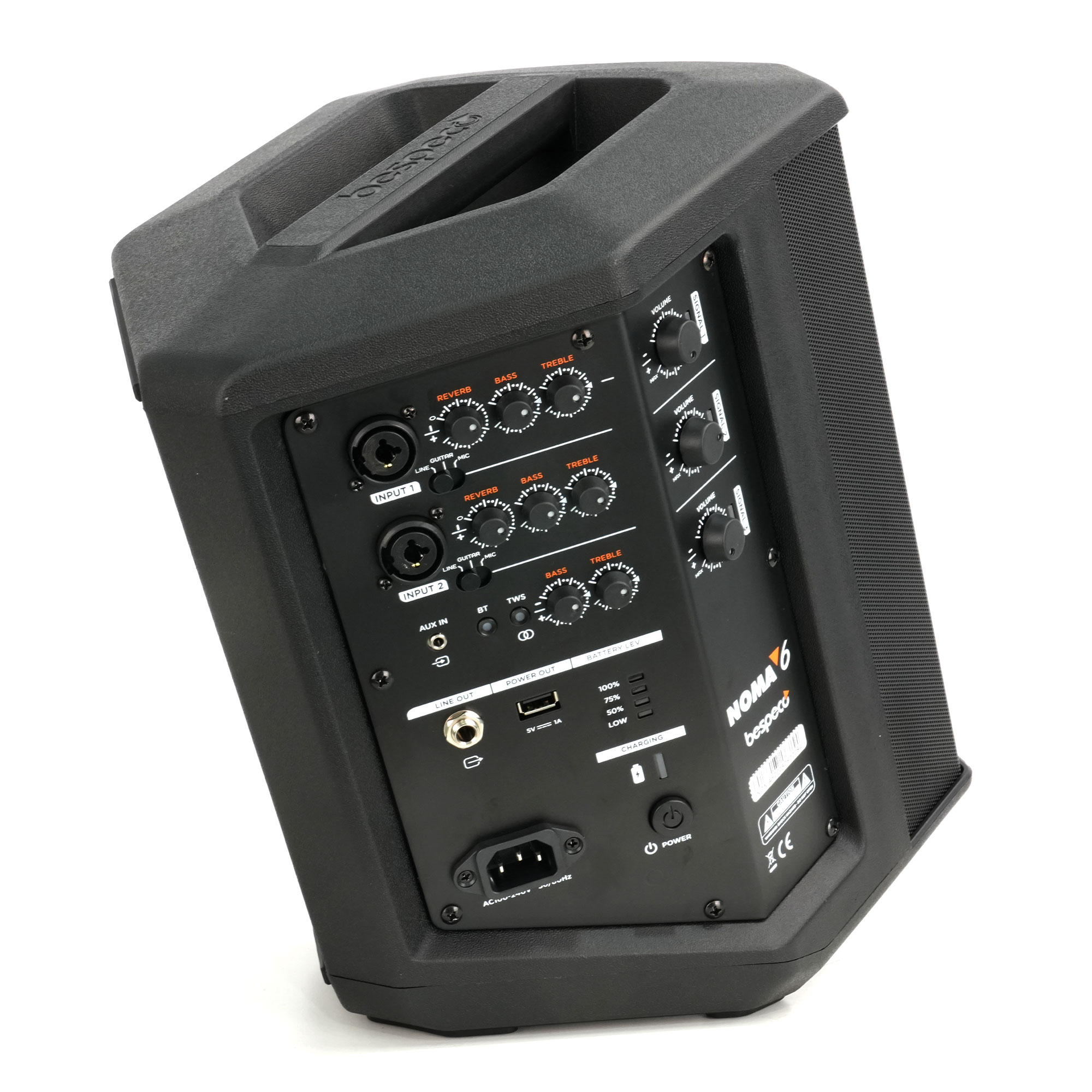 De Noma 6 is een multifunctionele draagbare mini-PA van 200 watt met meerdere kanalen. Er zijn twee kanalen met een gecombineerde jack/xlr-ingang. Deze kun je met een schakelaar een voorinstelling meegeven voor gitaar-, microfoon-, of line-signaal. De klank stel je verder in met de regelaars voor reverb, bass, treble en volume. Een derde kanaal is voor het afspelen van audio en heeft een aux mini-jackingang, maar kan ook via bluetooth verbinden met bijvoorbeeld je telefoon, tablet of laptop.